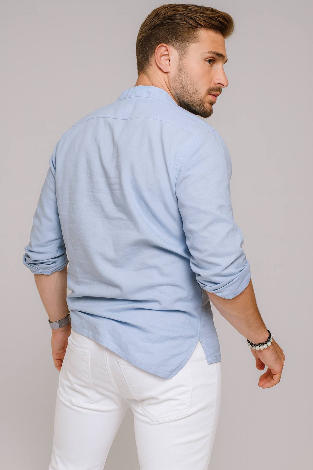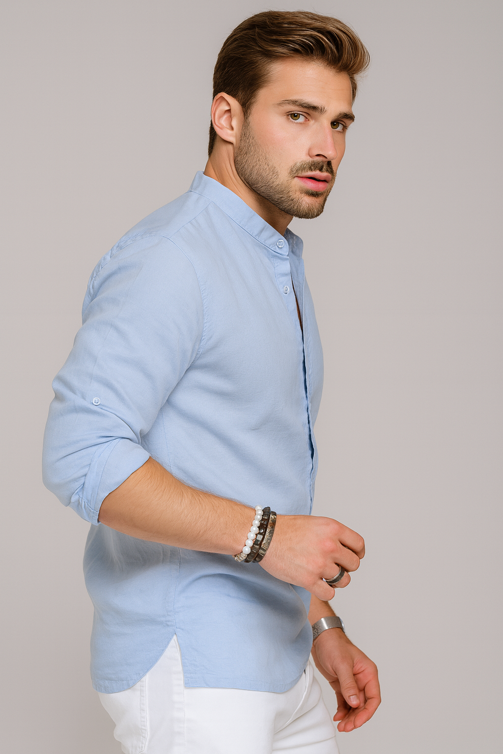 Με Ιταλικό ύφασμα, μάο γιακά και κλείσιμο με κουμπιά.